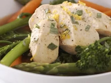 Poached Lemon and Tarragon Chicken with Tenderstem, Chantenay Carrot and Asparagus Broth