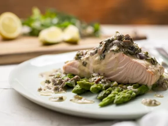Poached Salmon Fillets with Asparagus and Warm Olive Sauce