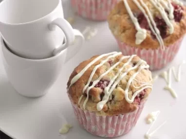 2. Fork the melted butter, eggs, yogurt and vanilla together in a second bowl until just mixed then add to the dry ingredients and fork together until just mixed. Add the raspberries and diced chocolate, mix together briefly then spoon into muffin cases.
