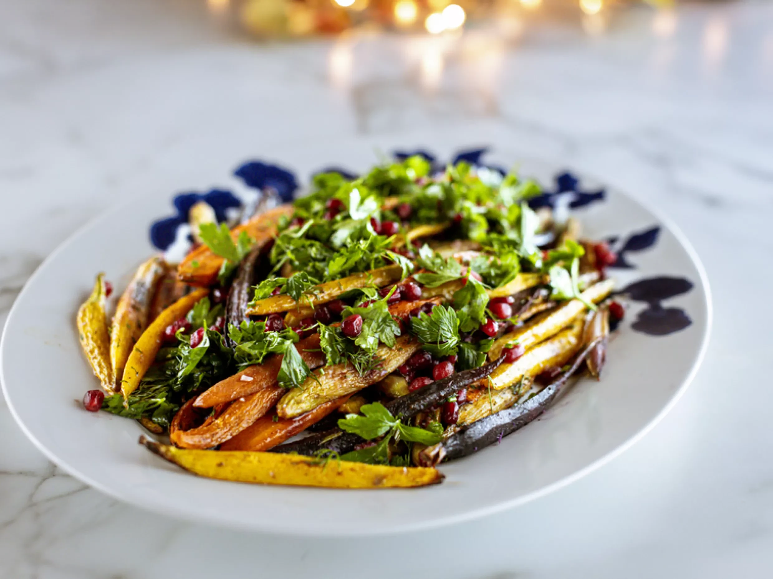 - When the carrots are ready, remove them from the oven and transfer them to one sheet pan. Pour over the maple syrup mixture and toss to combine. Transfer to a serving platter and garnish with the herb salad and pomegranate seeds.