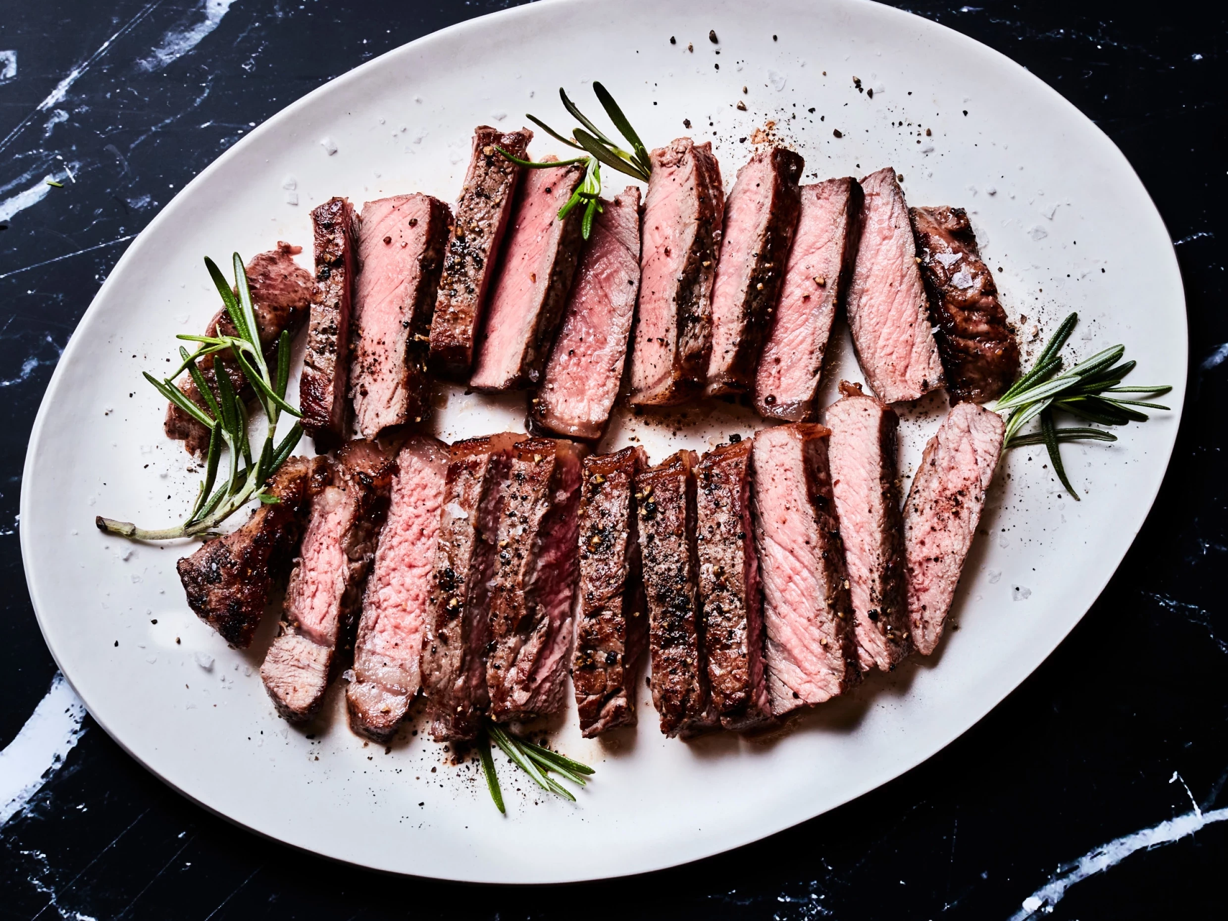 - Heat a cast-iron skillet over medium-high heat. Add the oil, then sear the steaks on the first side for about a minute. Flip the steaks and add the butter to the skillet. Once the butter has melted, continue to cook the steaks, continuously basting with the melted butter, until seared on the second side, about 45 seconds. Sear the fat cap as well to crisp up, 30 seconds to 1 minute.