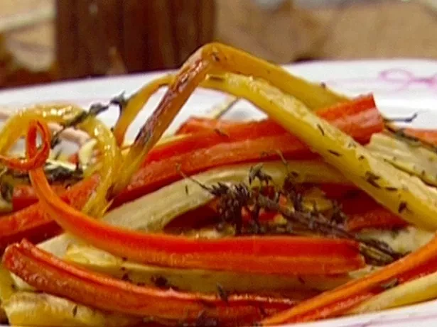 3) Drizzle the carrots and parsnips with the olive oil and honey. Season with salt and pepper and toss to coat. Scatter the thyme sprigs on top. Place them in the preheated oven.