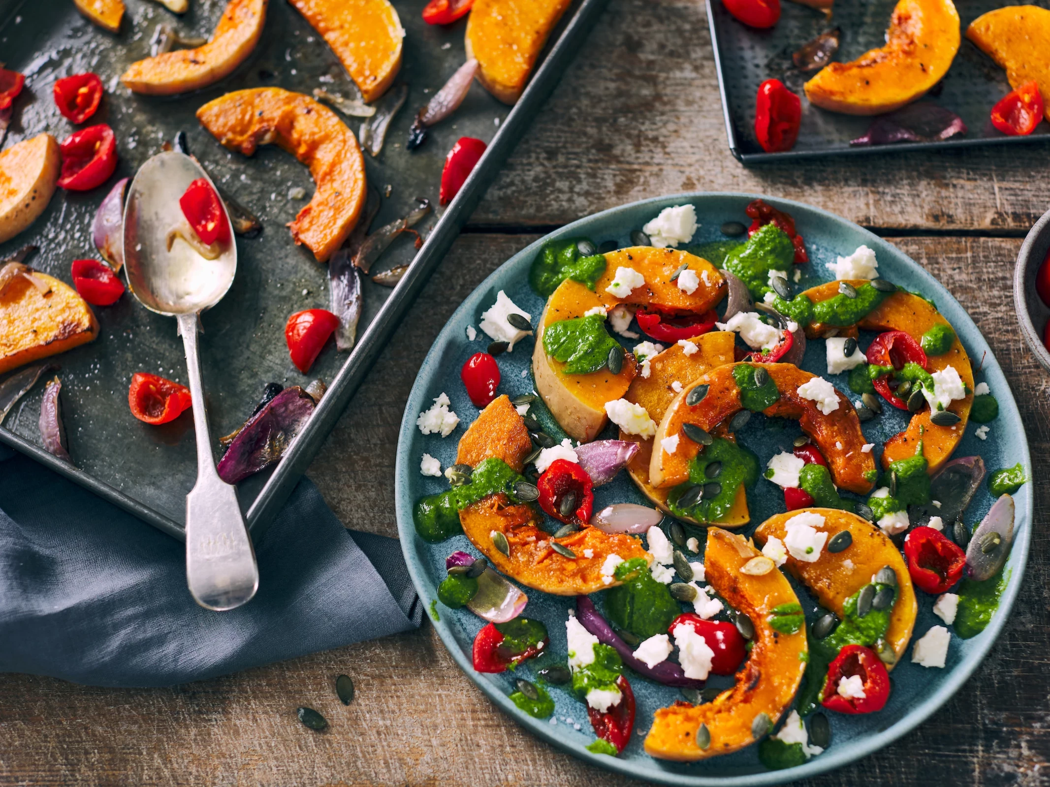 2) Put the aubergine, courgette, squash and tomatoes in one layer on one or two baking sheets, drizzle with olive oil and sprinkle generously with salt. Roast until the vegetables are soft and pliable, about 20 to 30 minutes, turning them halfway through the cooking. Remove from the oven and allow to cool. When cool enough to handle transfer the vegetables to a cutting board and cut them into 1.5cm pieces.