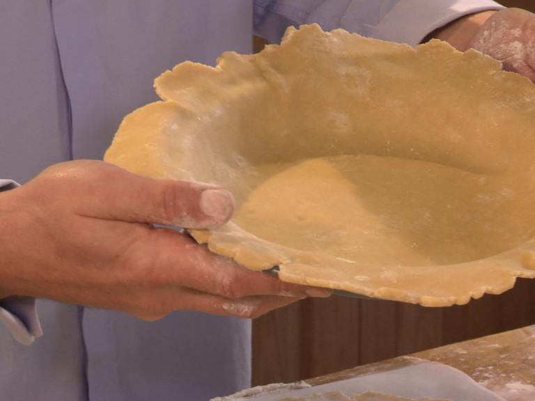 4) With a rolling pin, push down on the pastry to get a flat surface. Use the ends of your fingers on the rolling pin as the palms of your hands have too much heat.