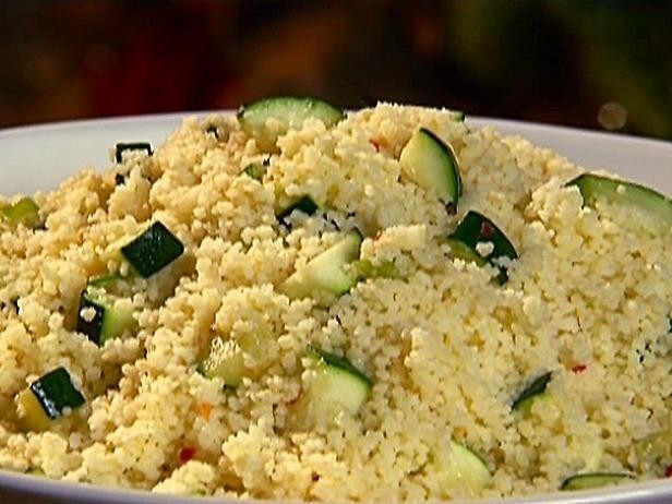 2) Meanwhile, heat the olive oil and melt the butter in a saute pan. Add the courgette and cook for 5 minutes, or until lightly browned. Bring the chicken stock just back to a boil. Place the couscous in a large bowl and add the cooked courgette. Pour the hot chicken stock over them. Cover the bowl tightly with plastic wrap and allow to stand at room temperature for 15 minutes. Add the basil and parsley. Toss the couscous and herbs with a fork, and serve warm or at room temperature.