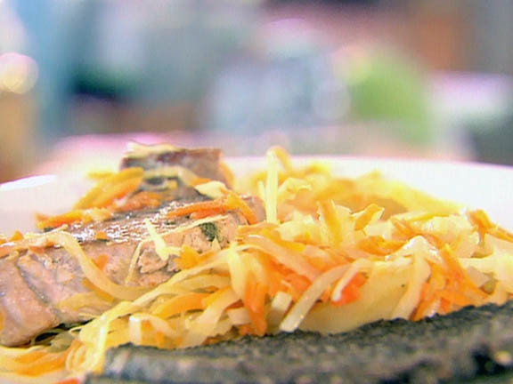 1) Combine the 3 teaspoons of the fresh sage or 1 teaspoon dried, garlic, 1/2 teaspoon of salt and a few grinds of fresh pepper. Rub this mixture all over the pork chops and let the chops sit at room temperature for 10 minutes. Meanwhile, thinly slice the onion, apple and cabbage and julienne the carrots.
