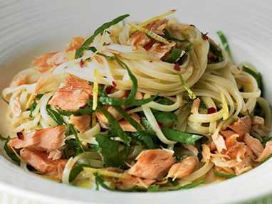 4. Pop the pasta back into the pan, add the salmon and tomatoes with the pesto and heat through.