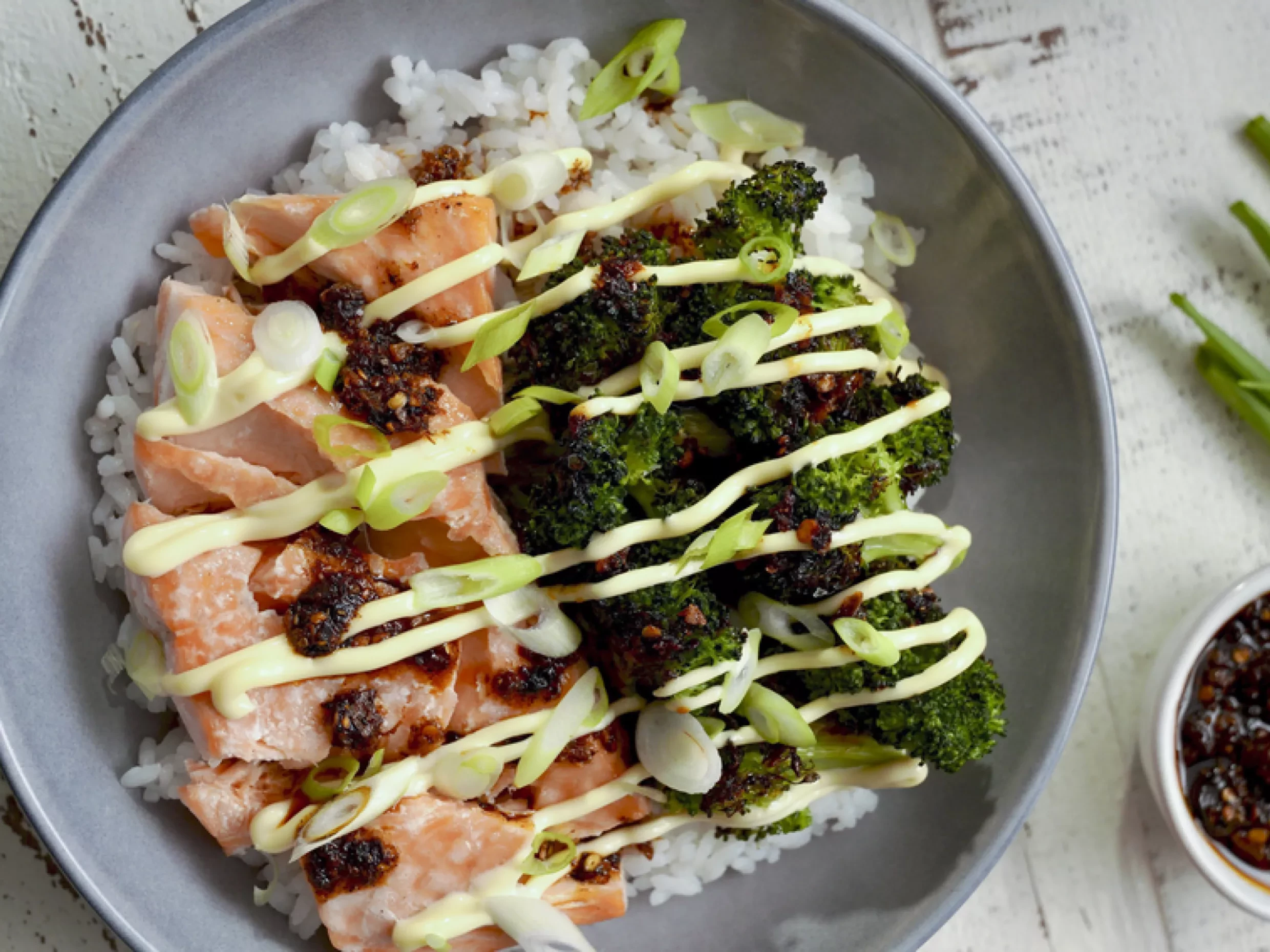 - To serve, divide the rice among bowls. Top with the salmon and break into rough chunks. Then add some crispy broccoli and top with mayo, chile crisp, scallions and flaky salt.