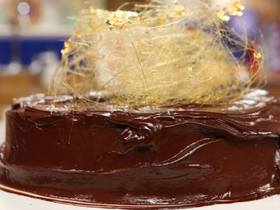 Cover the cooled cake with the chocolate glaze and use a palette knife to spread it evenly over the top and down the side. Lightly sprinkle sea salt crystals on top of the cake, and chill it in the refrigerator until set before serving.