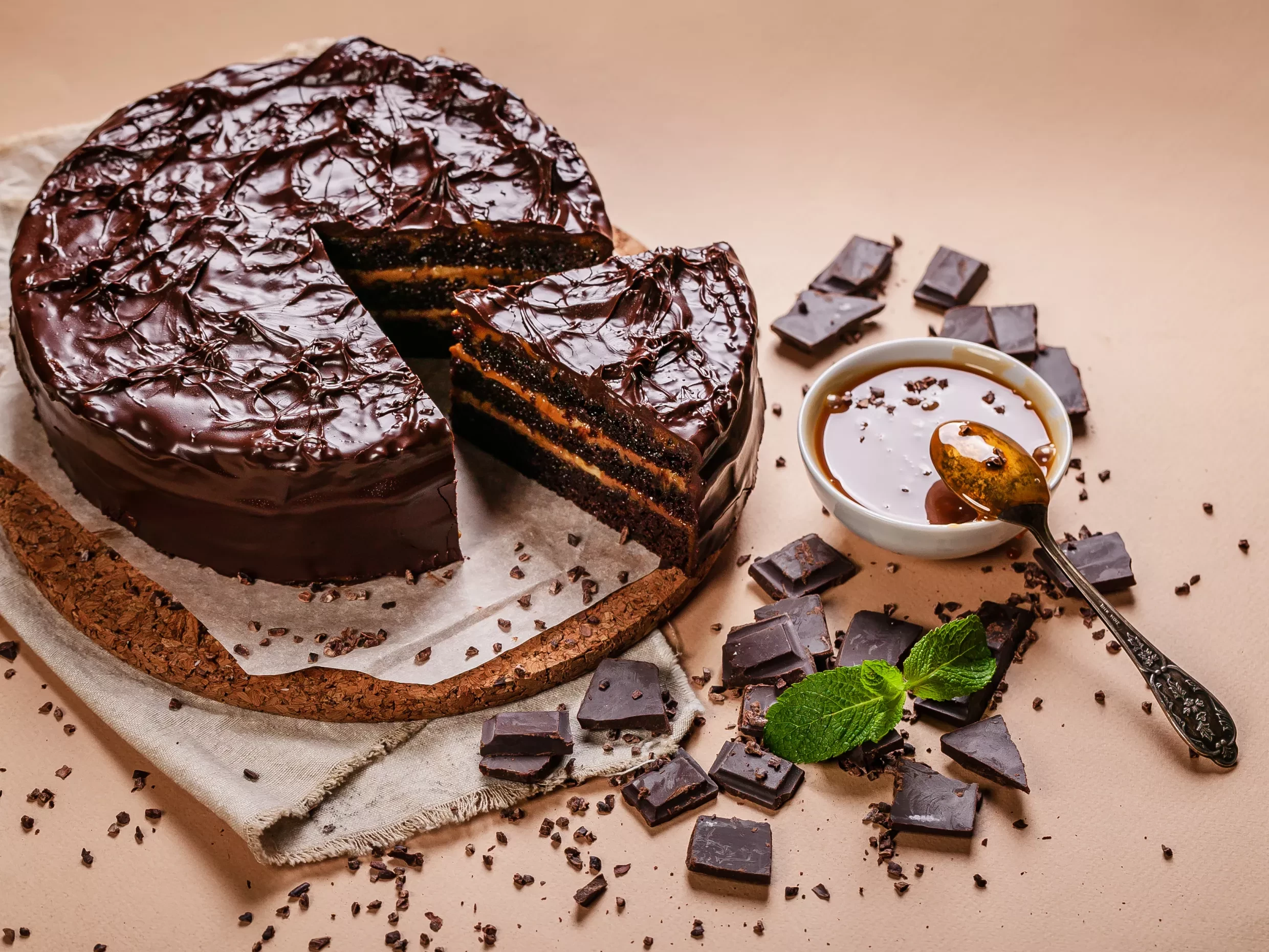 Dark, glossy, and gloriously grown-up, this salted butter cake recipe combines fudge chocolate sponge and caramel biscuit into a show-stopping slice.