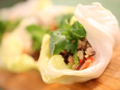 2. Spoon the mixture into individual lettuce cups and garnish with the red chillies, spring onions, coriander, mint and toasted cashews.