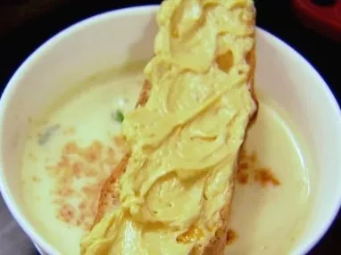 3) In a medium bowl, place the yolks over a pot of boiling water, whisk briefly, add the reduced clam stock mixture and whisk until thickened. Slowly add chilled uni butter, add chopped tarragon and tarragon vinegar, keep warm.