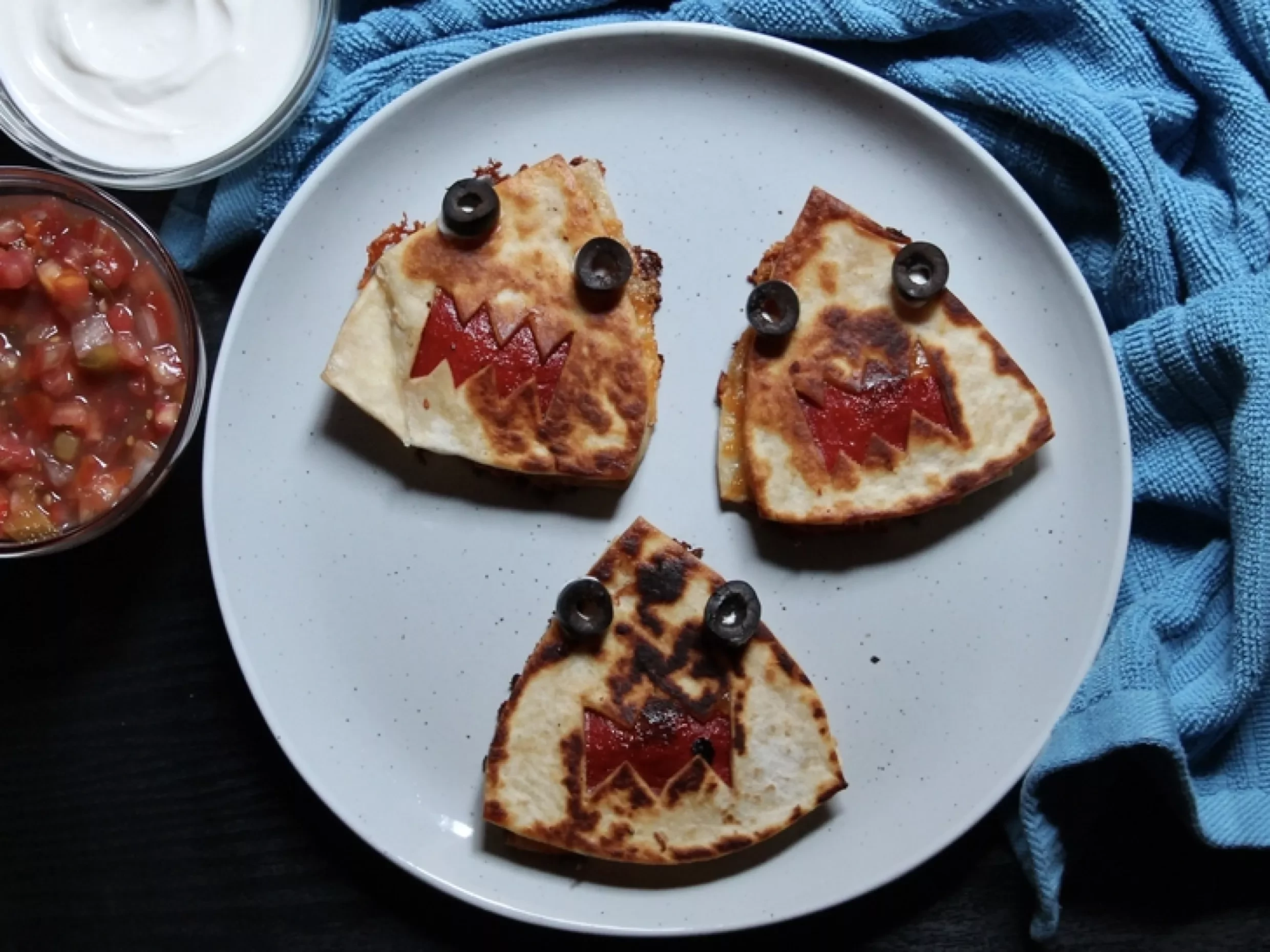 - Melt the butter in a large nonstick skillet over medium-high heat. Arrange the 4 shark quesadillas in the skillet. Cook until golden brown and crisp, about 3 minutes per side. Transfer to a serving plate. Dip the black olive slices in the sour cream and place 2 on each shark quesadilla for the eyes, using the sour cream to make them adhere.