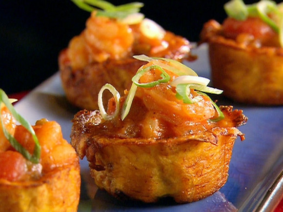 2) Mix the cornflour with the cold water. Stir the cornflour into the tomato mixture and cook for about 2 minutes. Add the prawns and cook for about 2 to 3 minutes, until the prawns are done to a pink colour. Spoon the prawn creole into the tostones and garnish with spring onions.