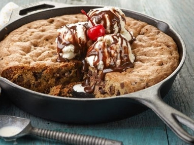 Spread the mixture into a 10-inch skillet and bake until golden brown, 30 to 40 minutes. Remove the skillet from the oven, top the cookie with several scoops of your favorite ice cream, drizzle on some hot fudge and top with whipped cream and a cherry.