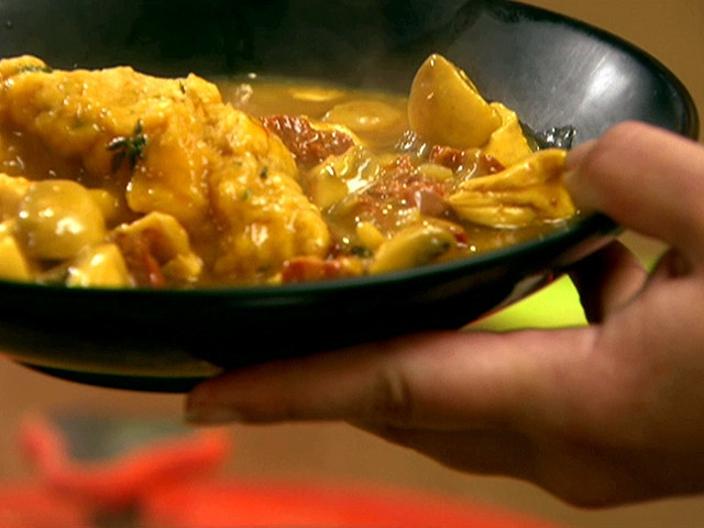 3) Stir in the mushrooms, onions and garlic and add the bay leaf, salt and pepper, to taste, and the thyme. Put on the lid and increase the heat to high for 5 minutes to soften the vegetables. Stir in the flour, add the sherry and stir a minute more, then add the saffron broth.