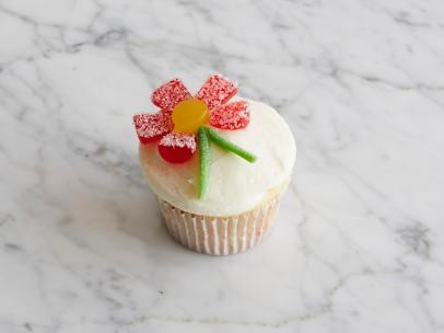 Cut the red gumdrops in half diagonally and press the cut sides into the sanding sugar. Arrange in a petal pattern slightly off center on the cupcake, with the narrower end toward the center. Put the yellow gumdrop wide-end up in the center.