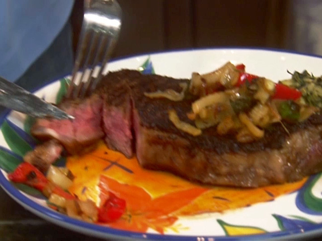 4) For the saute: add oil to a medium sized saute pan over medium heat. Add onions, fennel and red bell pepper and saute until tender. Season with salt, pepper and stir in the basil before serving with steaks.