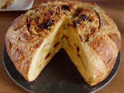 Cut a 7-inch round disk off the top of the boule using a long bread knife or serrated slicer. Tear the disk into pieces and scatter in a large roasting pan. Cut all the way around the inside of the boule just inside the outer wall.