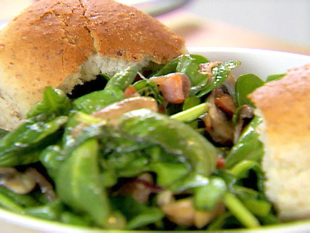 3) For the salad, in a large salad bowl, toss together the spinach, mushrooms, bacon and onion. Pour the dressing over the salad and toss to combine. Serve warm.