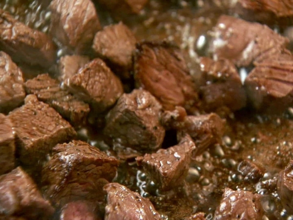 Place some of the meat in the pan in a single layer. It should sizzle loudly when it hits the pan - if it doesn't, the pan isn't hot enough. Don't stir or disrupt the meat for 30 to 45 seconds. You want it to sizzle and brown on one side. Scoop as many steak bites as you can with your spatula and flip them over. Repeat until all the meat is turned. Cook for an additional 30 to 45 seconds-just long enough to sear the outside of the meat but NOT cook the inside.