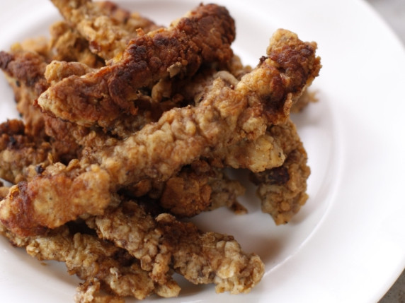 3. Heat the butter and vegetable oil in a large skillet over medium to medium-high heat. Fry the steak strips 4 or 5 at a time, turning midway through. When golden brown, remove from the skillet to a paper towel-lined plate. Continue with the remaining meat. Cover loosely with foil to keep warm.