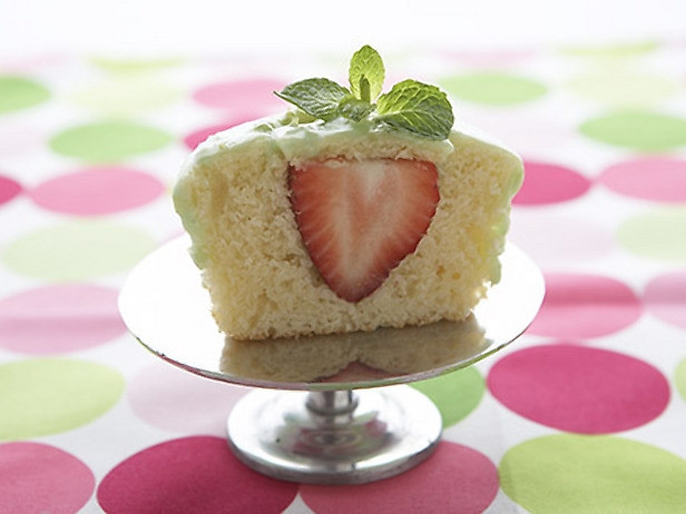 7) For the assembly: Remove cupcake from its liner. Cut and remove a strawberry (coned) shaped portion of cupcake from the top of each cupcake, leaving about 2cm of cake in the bottom. Stuff each cake with a strawberry and cover with a little bit of cake. Spoon and spread icing over the top of the cupcakes. Sprinkle with green sanding sugar. Top with small mint leaves or candied leaves.