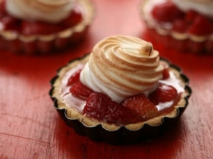 Once cooled, fold into strawberries and spoon into baked tart shells. Chill while preparing meringue.