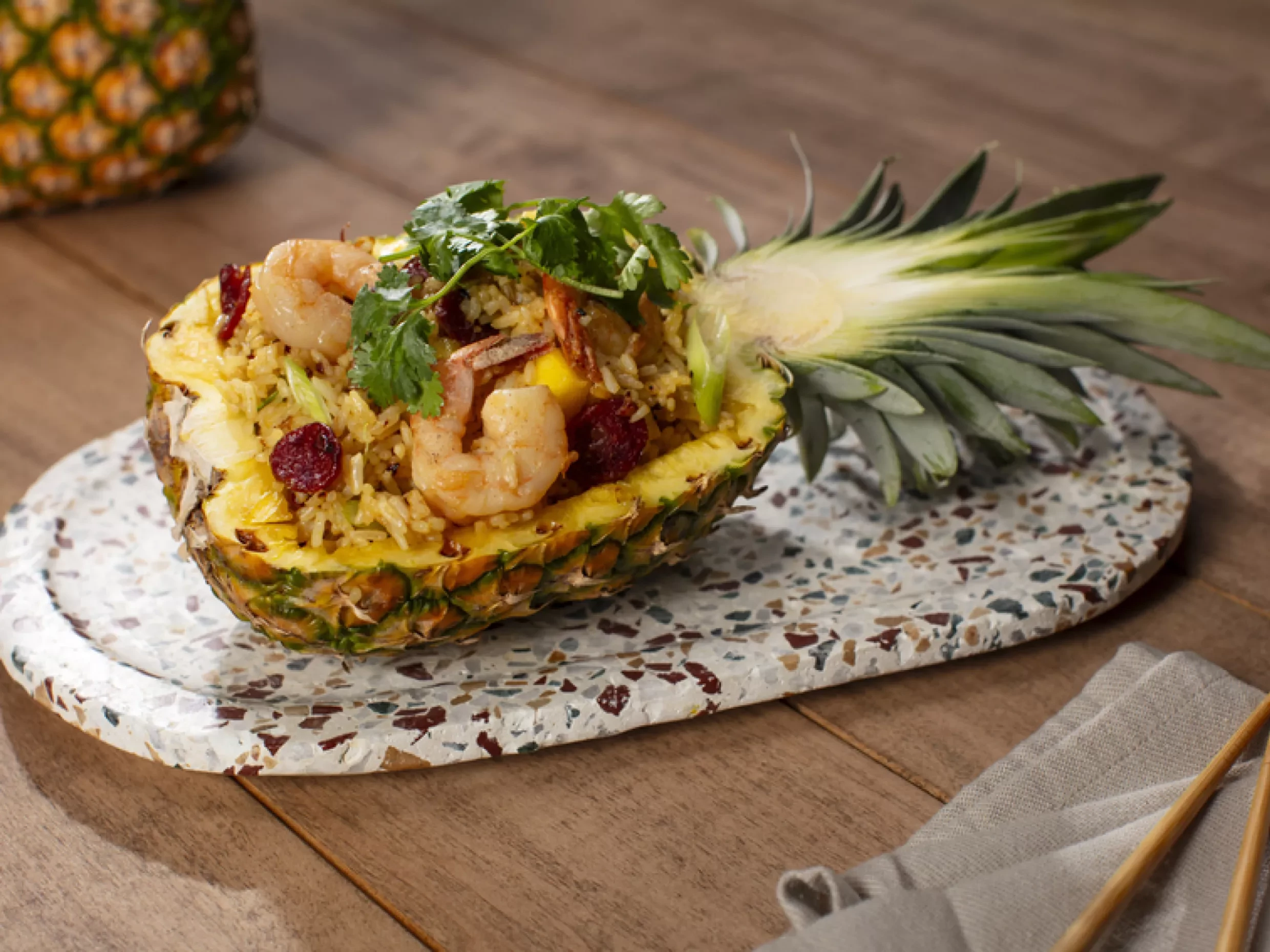 - Stuff the pineapple with the ribs. Place the top and bottom pieces back on the pineapple and secure them in place with 4 long bamboo skewers.