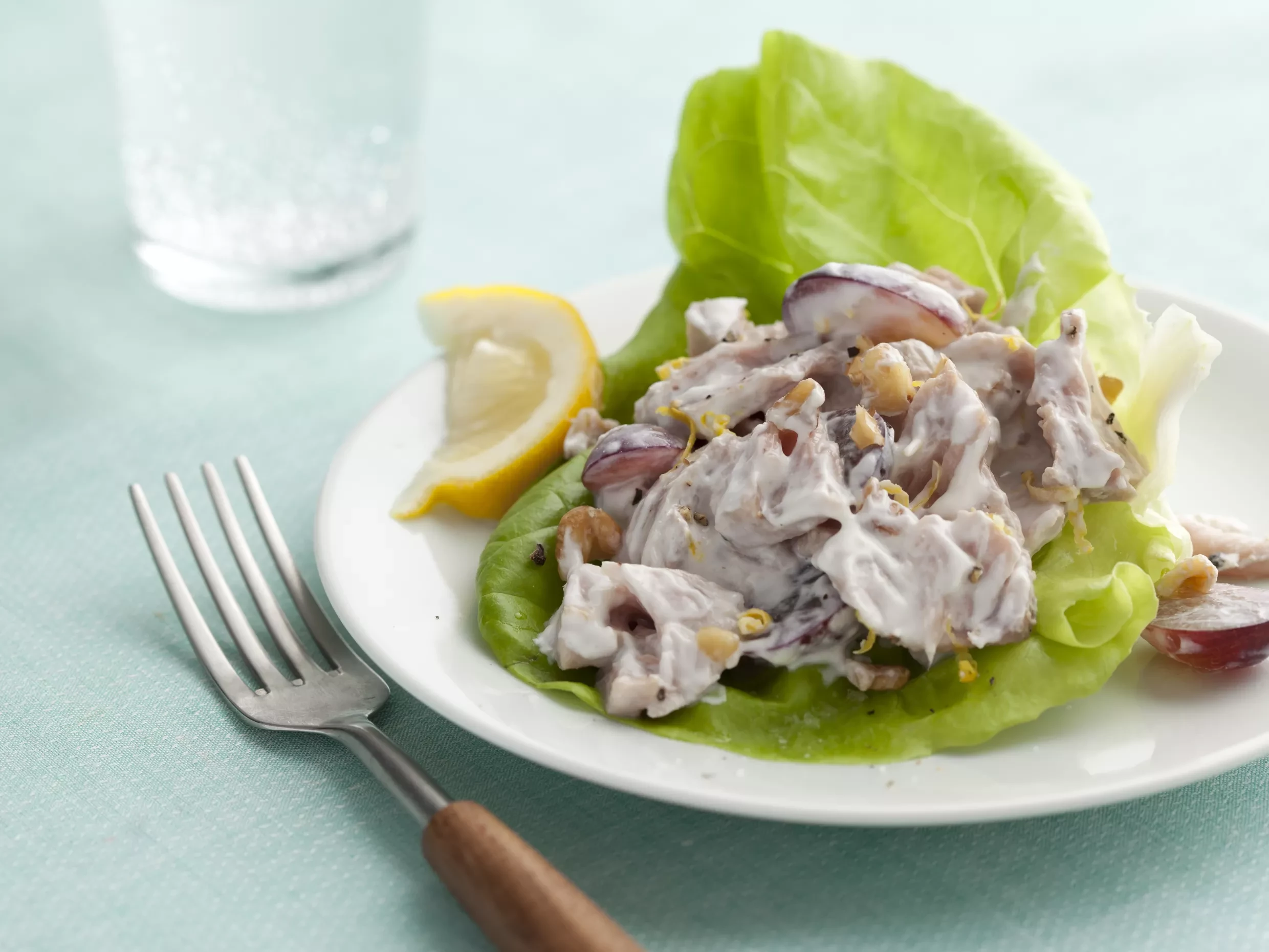 Claire Robinson's refreshing tuna salad is perfect for a light summer's lunch, made with roasted lemon-infused fish, creamy yogurt, sweet grapes, and crunchy walnuts.