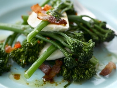 Tenderstem Broccoli with Chillied Bacon Lardons, Mozzarella and Basil Dressing