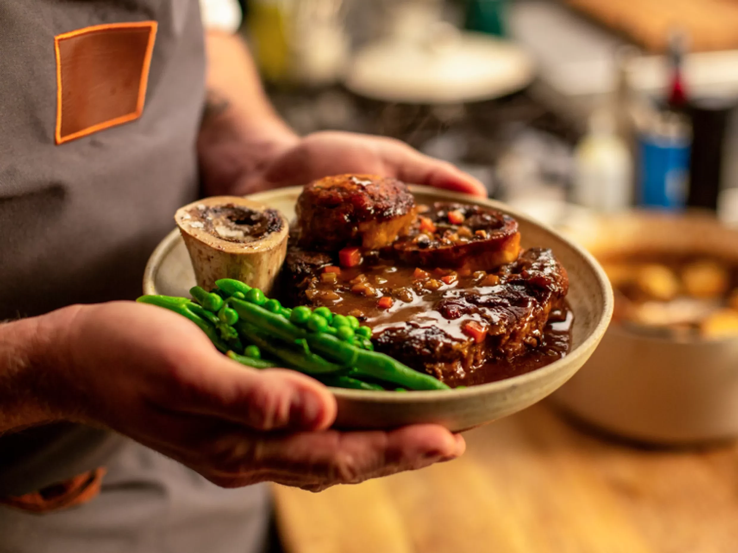 This rich, slow-cooked beef stew uses an osso bucco-style cut, with extra flavour coming from the bone marrow. The addition of dumplings flavoured with mustard makes for a very satisfying and comforting dish.