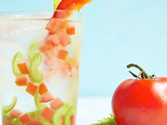 Place 1 diced ripe beefsteak tomato (about 10 ounces), 2 roughly-chopped stalks celery and 1 diced small red pepper in a pitcher. For still infused water, add 2 quarts of water. For sparkling water, add 1 quart of seltzer during prep and a second quart just before serving. Refrigerate 2 to 4 hours to allow the ingredients to infuse. Stir well and strain, discarding the solids. For serving, add fresh cut-up tomato, celery and pepper for garnish and plenty of ice. The infused water will keep refrigerated for up to 2 days.