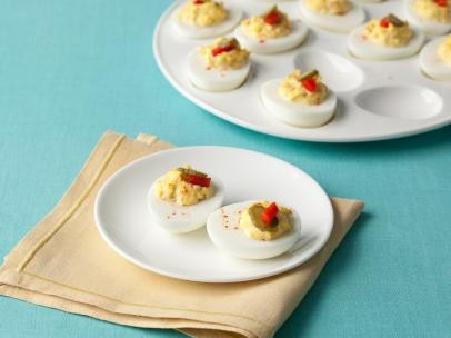 Fill egg whites evenly with yolk mixture. Garnish with paprika, pickles and pimentos. Store covered in refrigerator.