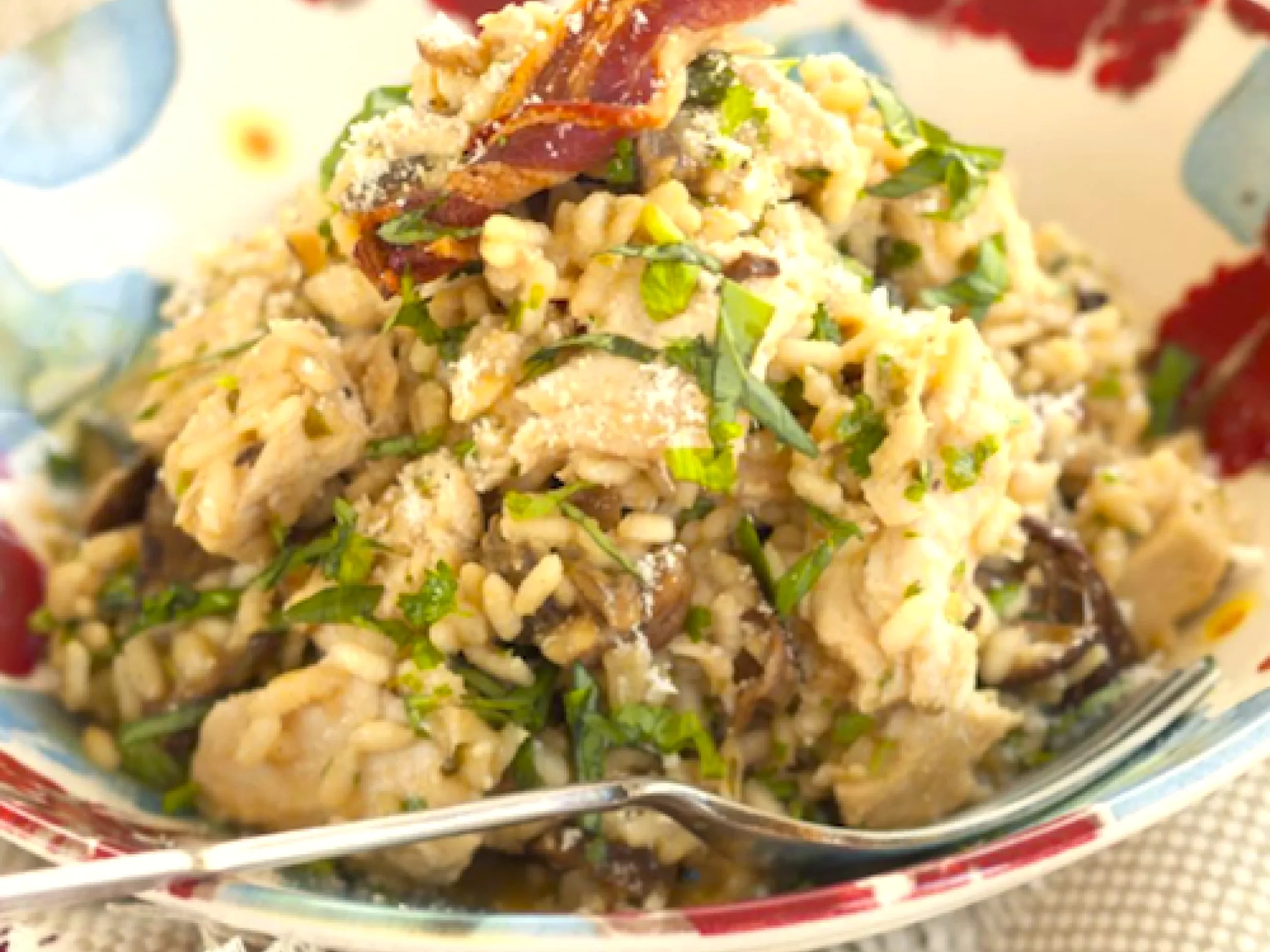 - Give the risotto a stir and serve with extra parmesan cheese and the basil leaves, top with the grilled crispy bacon or pancetta (optional).