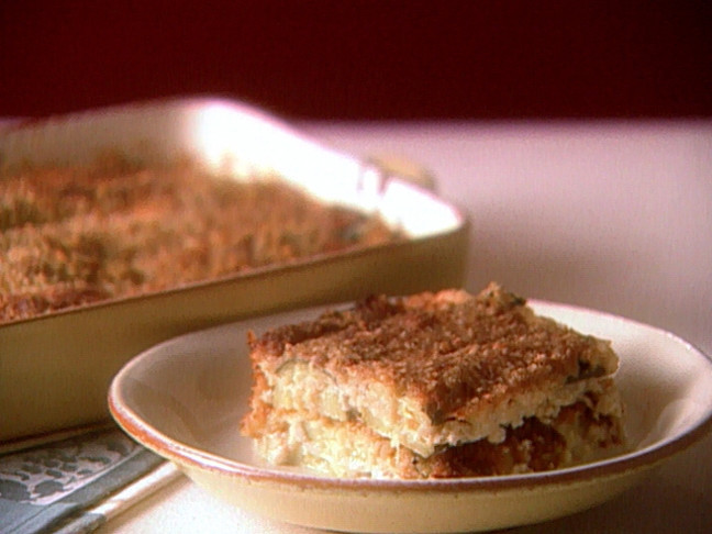 2) Coat the bottom of a 23cm x 33cm baking dish with extra virgin olive oil. Arrange the courgette slices on the bottom of the dish and season with salt and freshly ground black pepper. Evenly pour over 80ml of the double cream and sprinkle with 1/3 of the mozzarella, 1/3 of the fontina and 2 tablespoons of the Romano. Sprinkle with 1/3 of the breadcrumbs. Repeat the layers, ending with the breadcrumbs.