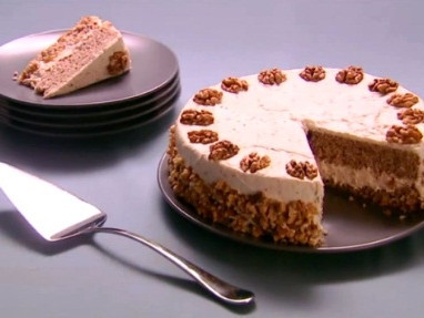 Garnish top of cake with walnut halves and chill.