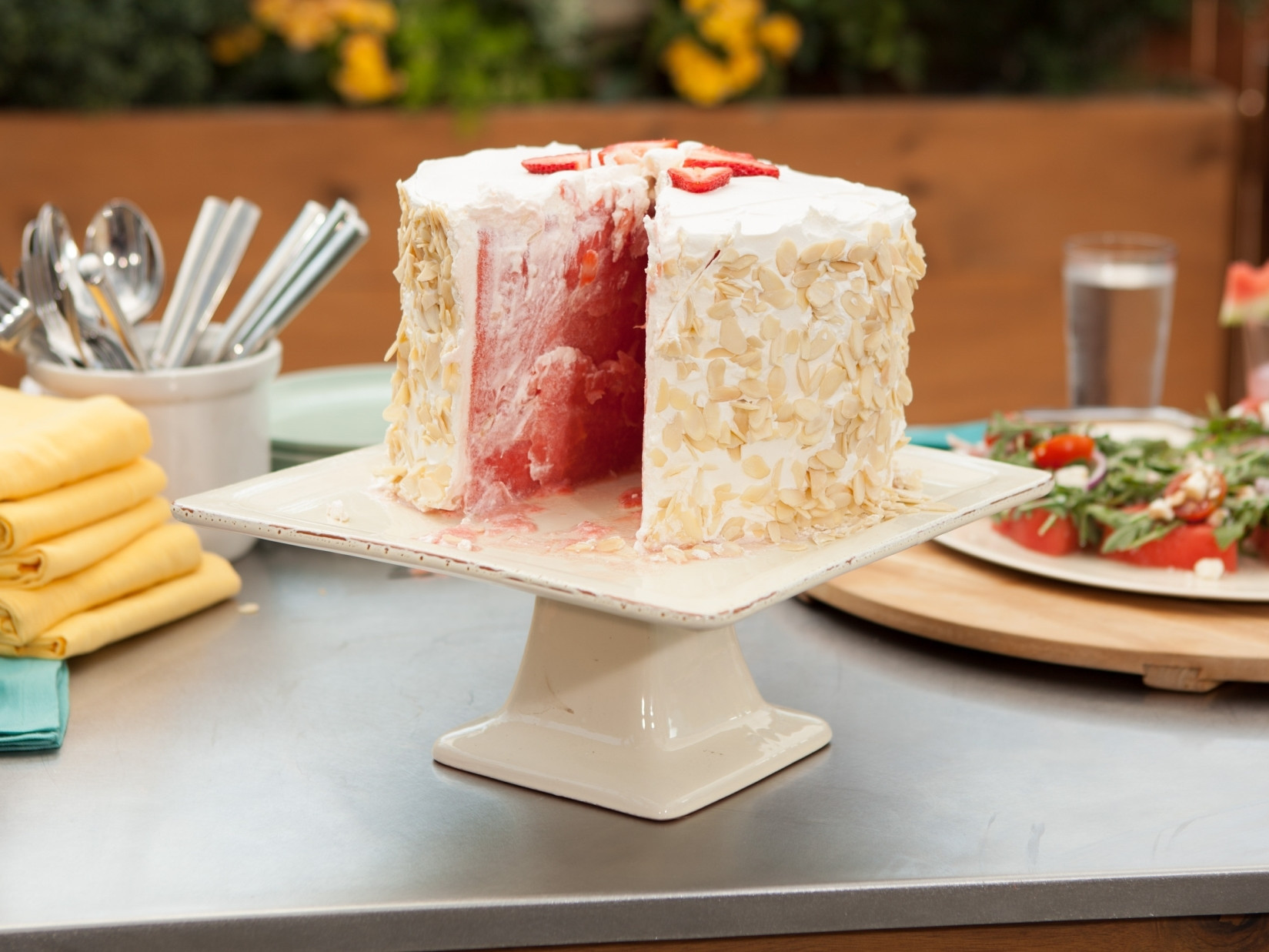 3. Cover the watermelon cake with the frosting. Press the almonds into the sides of the cake. Top with the strawberry slices. Cut into 6 to 8 wedges and serve immediately.