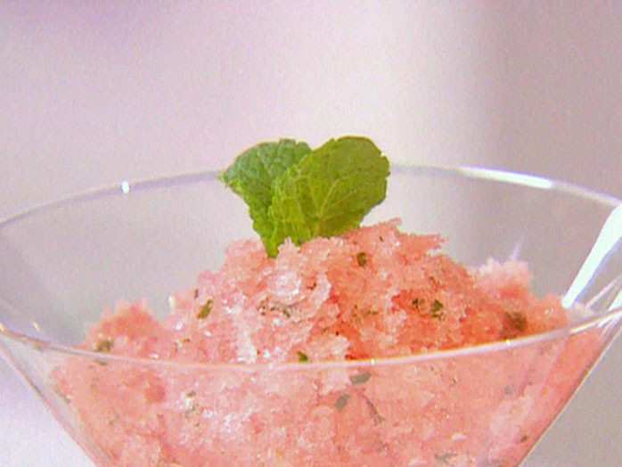 2) Combine the watermelon puree, lime juice, mint and sugar in a 23 by 22-cm metal pan. Place mixture in the freezer, scraping thoroughly with a fork every 20 to 30 minutes for about 2 1/2 hours, or until the granita resembles coarse crystals. Scrape one last time and spoon into parfait glasses or bowls.