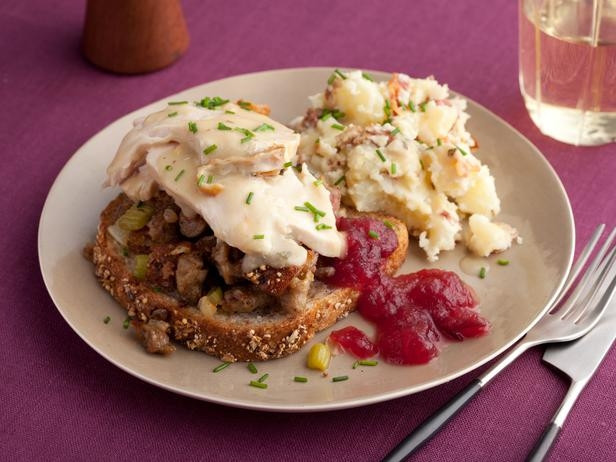 9) Place a bread slice on dinner plate. Use a large ice cream scoop to place a mound of stuffing on the bread. Place turkey on top of stuffing. Serve smashed potatoes and cranberries on the side. Spoon the extra gravy over potatoes and turkey sandwiches. Sprinkle the plates with chopped parsley or chives and serve.