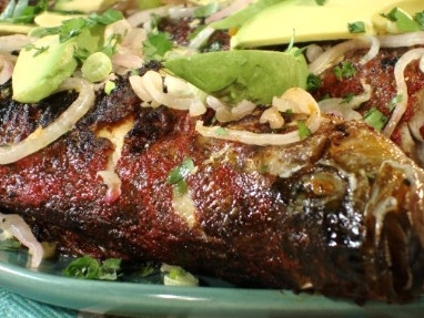 Whole griddled achiote striped bass with spicy pickled red onions