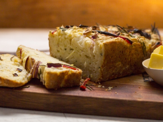 5. Spoon the batter into a prepared loaf tin and garnish the top with the Rosemary, onions and peppers.