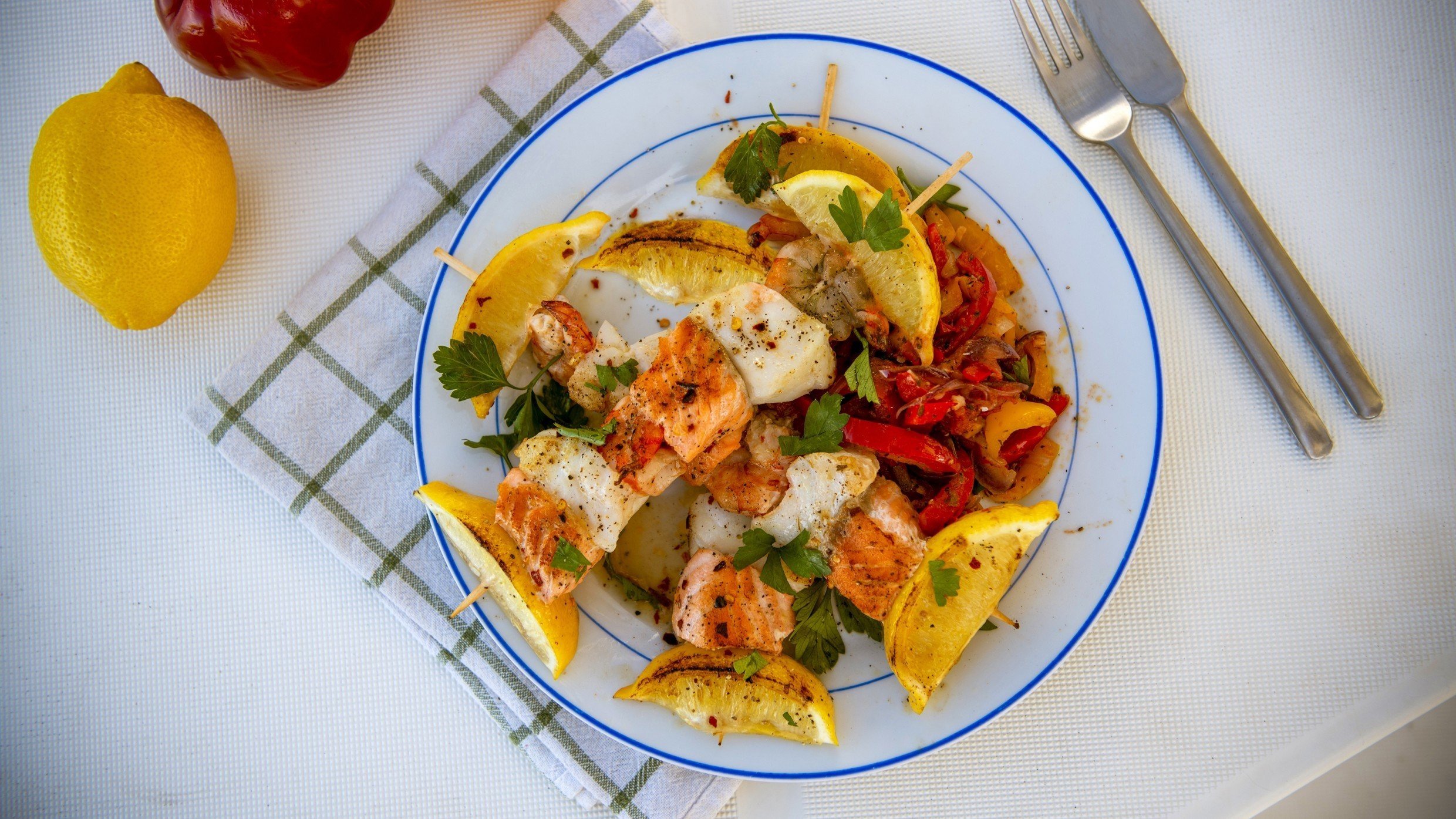Ainsley sets off on his Mediterranean food tour. In Corsica, Ainsley takes to the crystal-clear waters before making sustainably sourced seafood skewers with Peperonata.