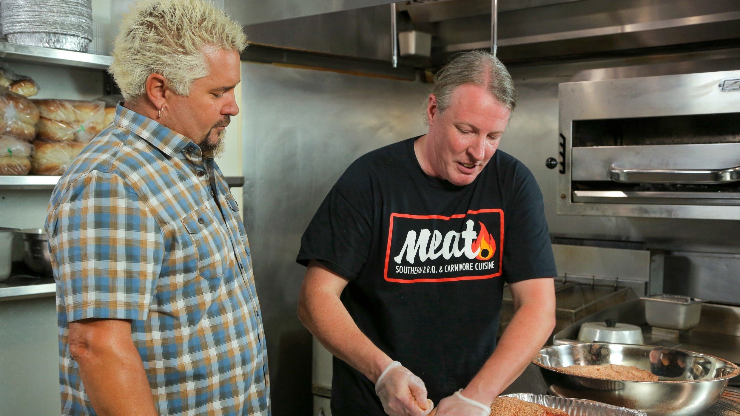 Guy Fieri looks for culinary creations you can sink your teeth into! He visits a catering truck full of beef tips, shrimp, and dirty bird wings.