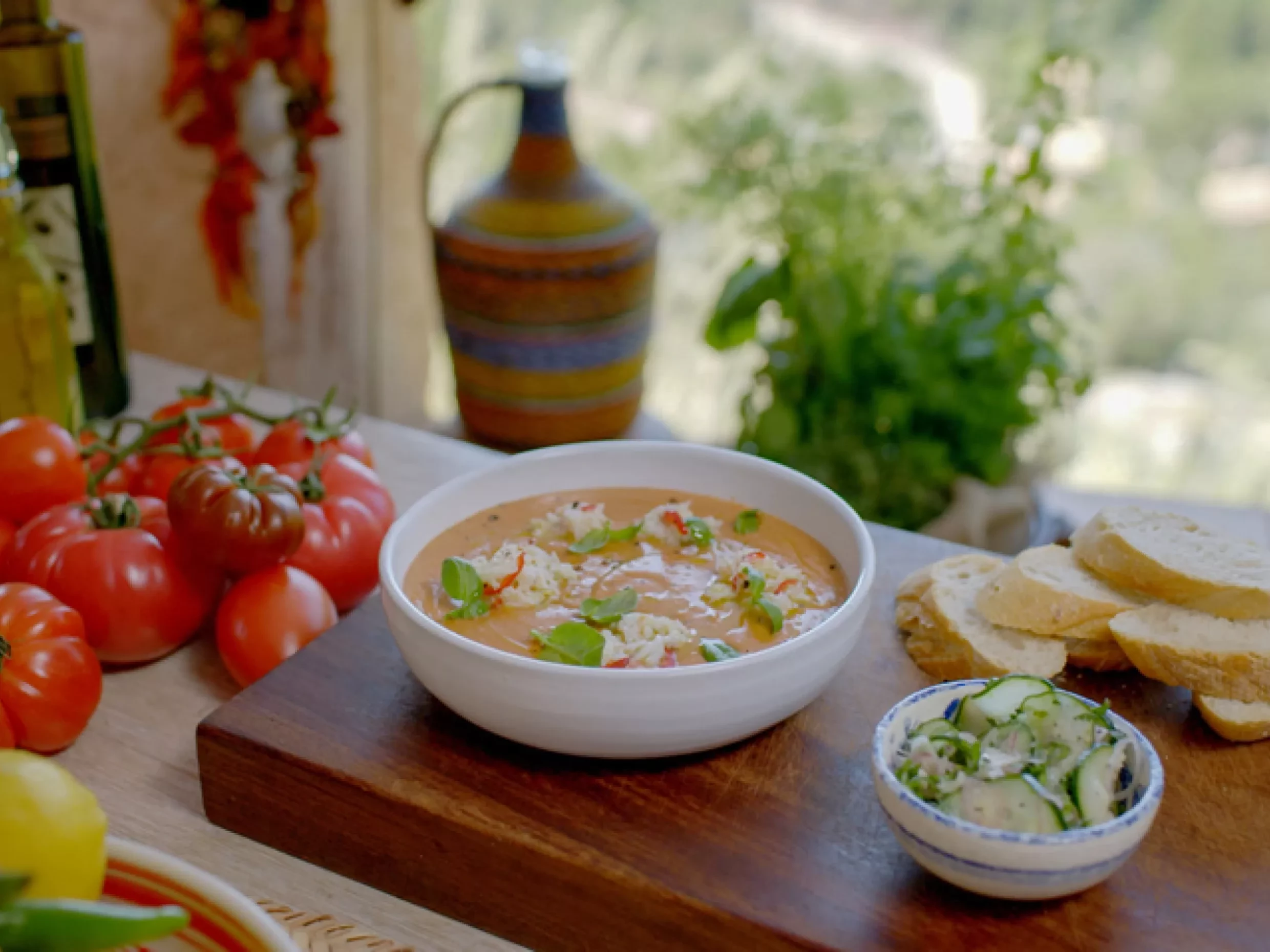 Marcus looks for lunch ingredients in the market in Palma. He makes chilled tomato soup, then chop chop salad with watermelon, pickled rind, and feta.