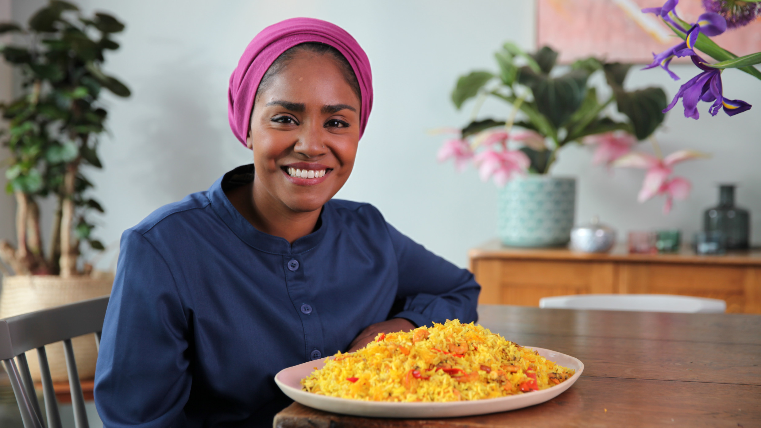 Nadiya is celebrating family get-togethers. On the menu are furikake fries, beef burgers with bacon jam, and jollof pilau with salted cucumber salad.