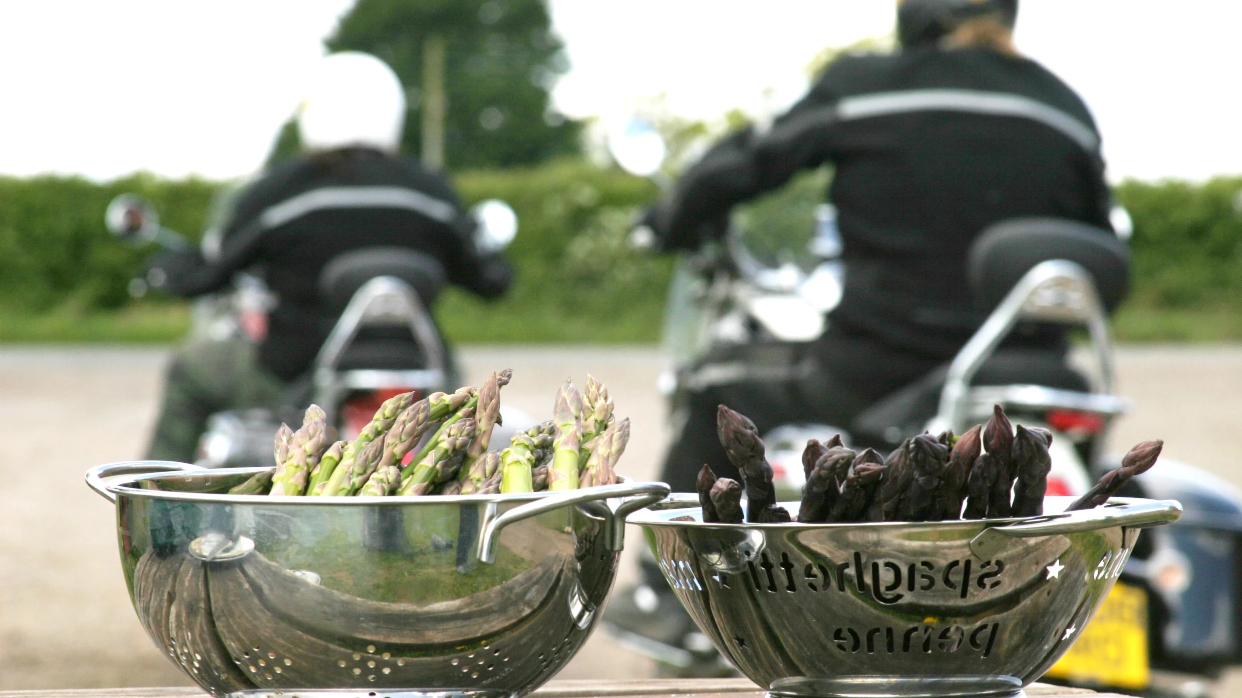The bikers travel to Fermanagh to explore the best of the county's larder. They cook traditional boxty and black bacon at Crom's Castle and go fishing for brown trout.